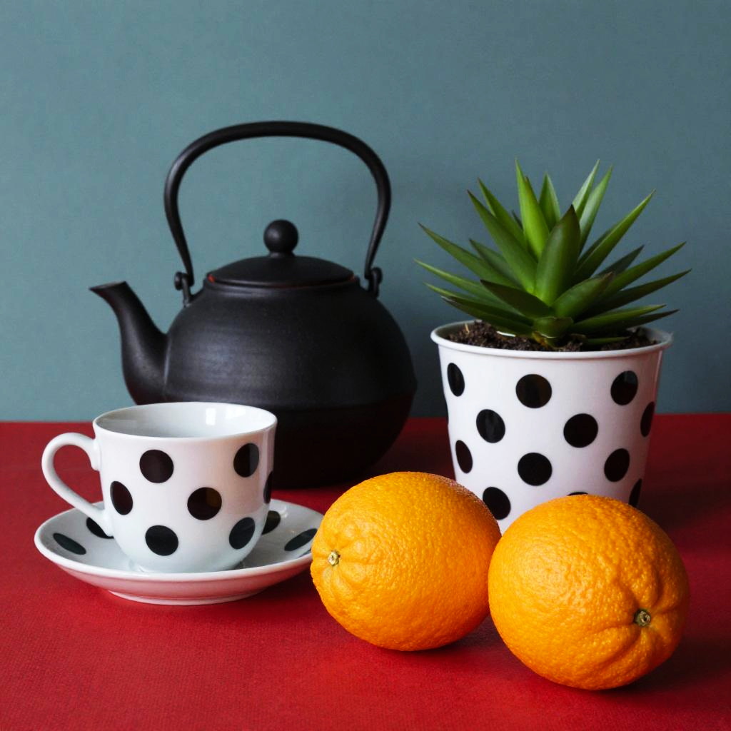 Photograph of a stylish still life setup. A black teapot with a curved handle sits behind a white cup with black polka dots on a matching saucer. To the right, a white pot with black polka dots holds a green, spiky plant. In the foreground, two bright orange fruits rest on a vibrant red cloth. The background is a teal wall with dramatic shadows.