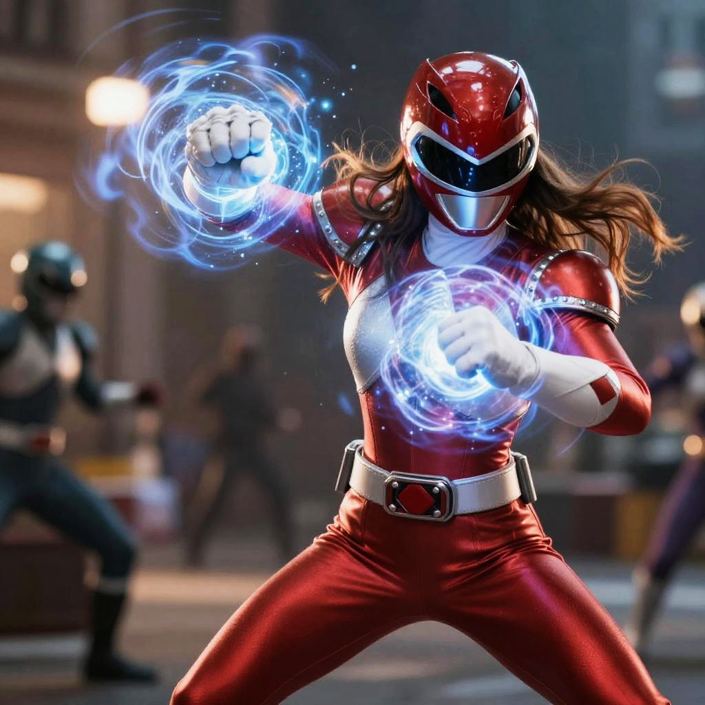 Natalie portman power ranger, iconic helmet and suit design, standing heroically on a rooftop at sunset, dramatic clouds, vibrant color palette, hyper-realistic style