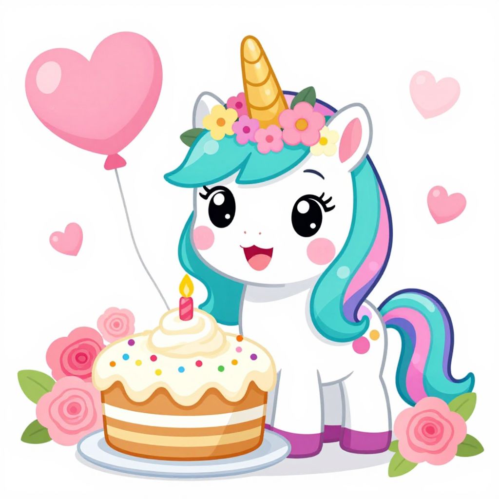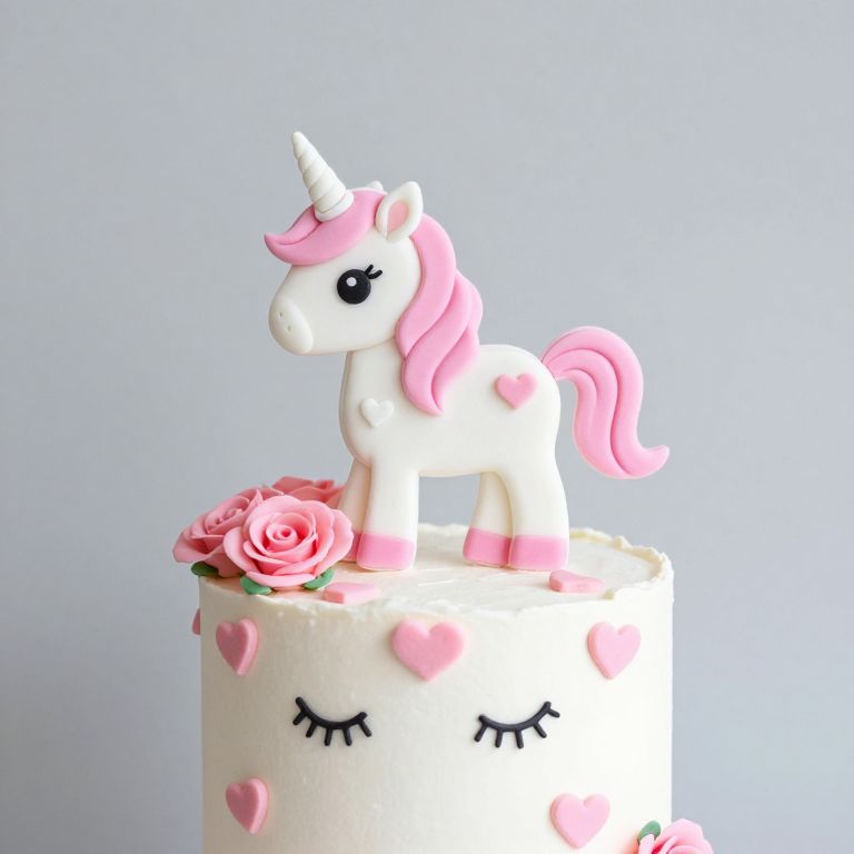 Cute unicorn cake topper featuring a white unicorn with pink accents, including a horn, mane, tail, hooves, and hearts, gracefully perched atop a single-tiered white cake decorated with pink roses, heart-shaped fondant details, and a playful eyelash design, all set against a soft gray background.