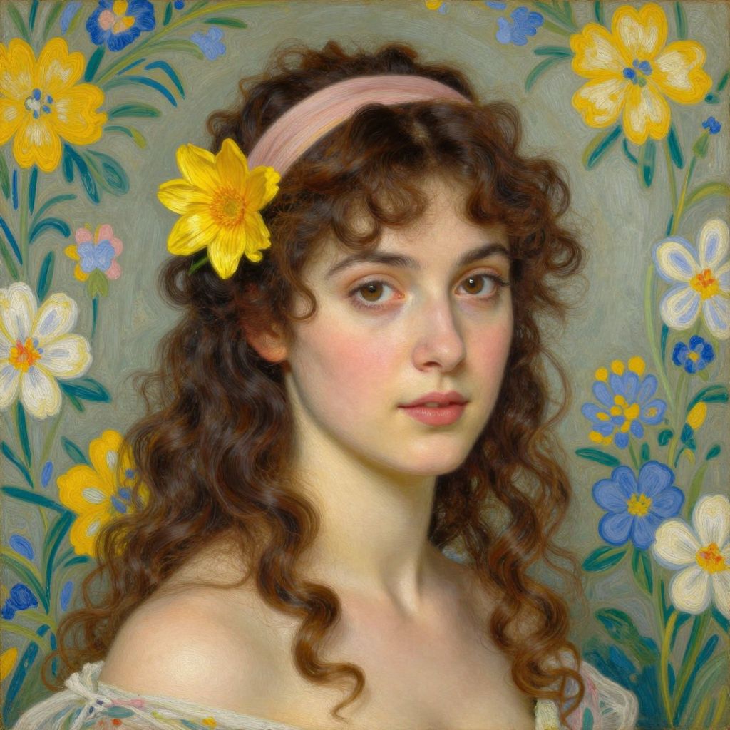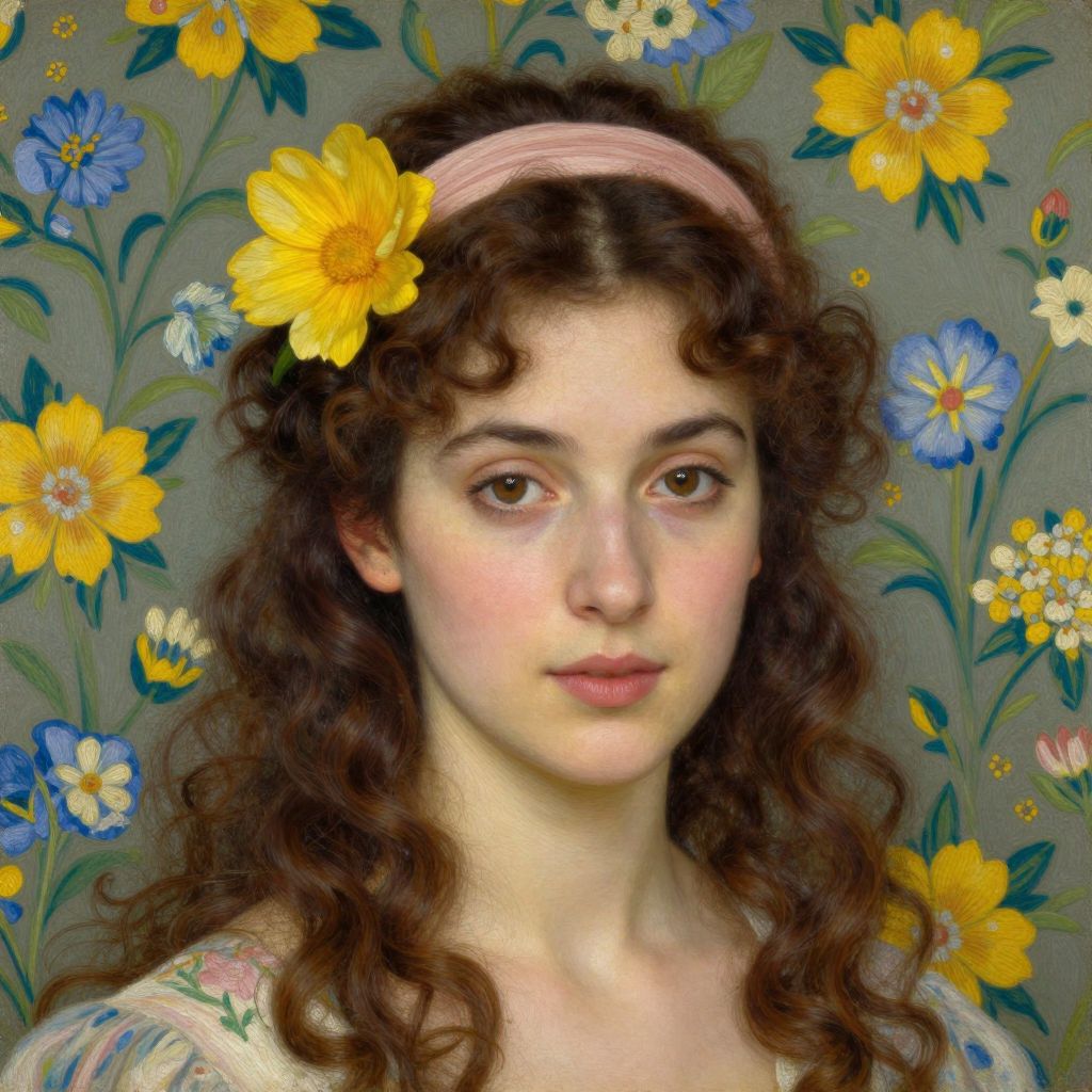 Romantic Impressionist painter Lucia Sarto's artwork depicts a serene portrait of a woman with curly brown hair adorned with a delicate pink headband featuring a yellow flower, set against a floral-patterned background with vibrant yellow and blue blossoms.