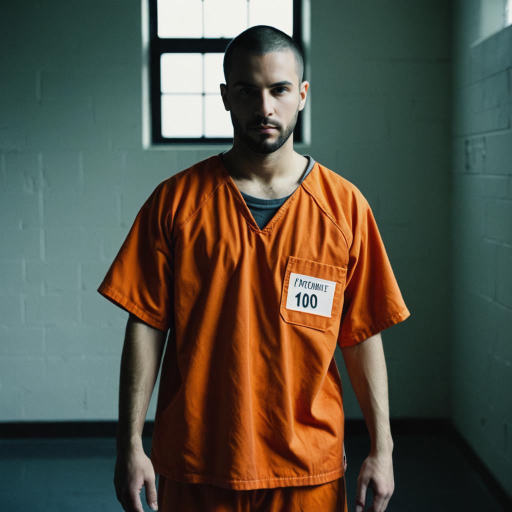 Photorealistic image of a young man with light brown short hair and slight stubble wearing an orange prison jumpsuit with a black belt and white undershirt. He has a serious expression with a slight smile, standing casually indoors in front of wooden doors with natural soft lighting highlighting realistic skin tones and shadows. The setting resembles a prison environment, accentuated by the jumpsuit and barred wooden door background.