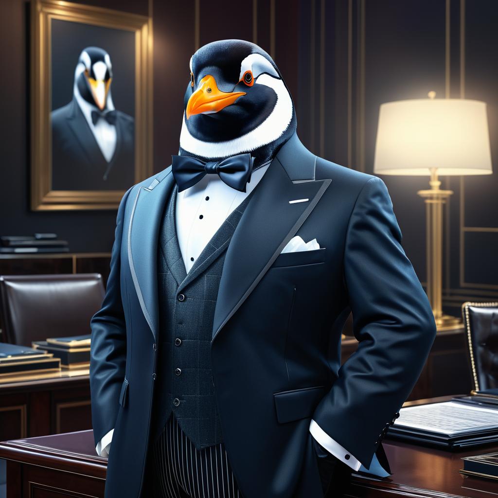 A digital painting of a stern-looking penguin dressed as a CEO, wearing a dark pinstripe suit, white dress shirt, blue patterned tie, and black top hat. The penguin is seated in a luxurious office setting with warm lighting and classic decor, exuding an elegant and authoritative atmosphere.