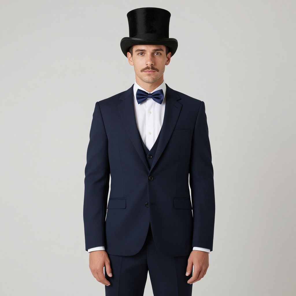 Gents fancy dress costume, 1boy, male focus, solo, top hat, hat, bowtie, bow, jacket, facial hair, suit, formal, pants, mustache, standing