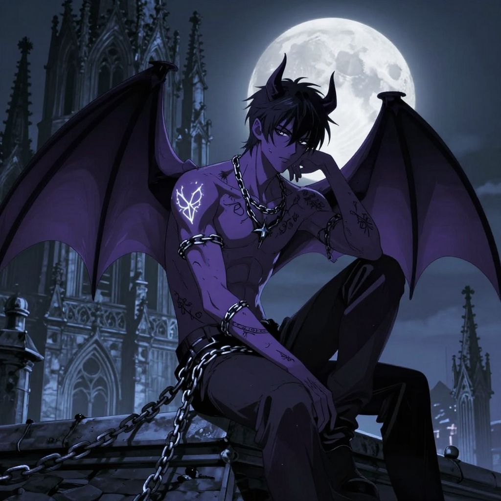 Young demon male anime with bat-like wings and dark purple skin, sitting on a gothic cathedral rooftop under a full moon, pale glowing tattoos and chains wrapped around his arms, melancholic yet mysterious atmosphere, detailed shading and anime art style.