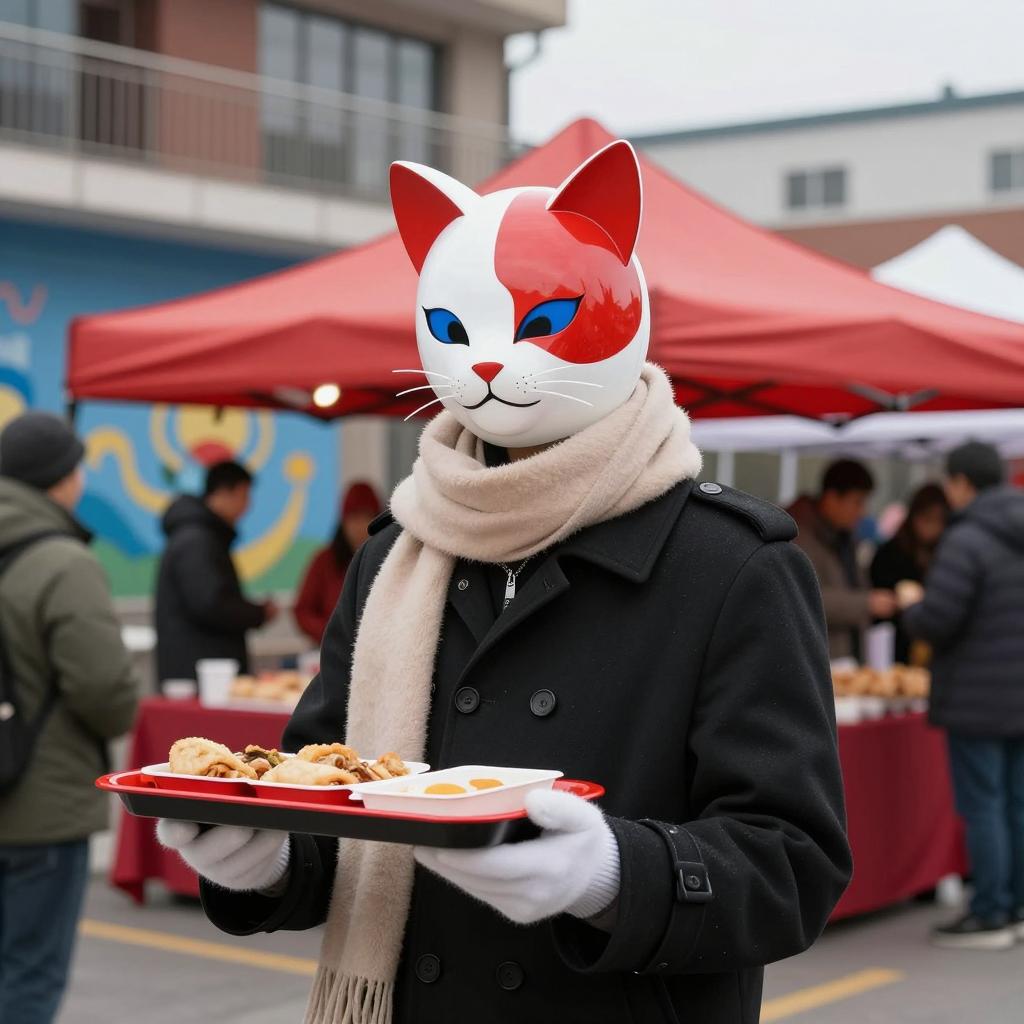Person in cat mask with red and white markings, blue eyes, wearing black coat, beige scarf, holding red and black tray with food. Background: red tent, blue mural, building with balcony, people. Outdoor event. Daylight.