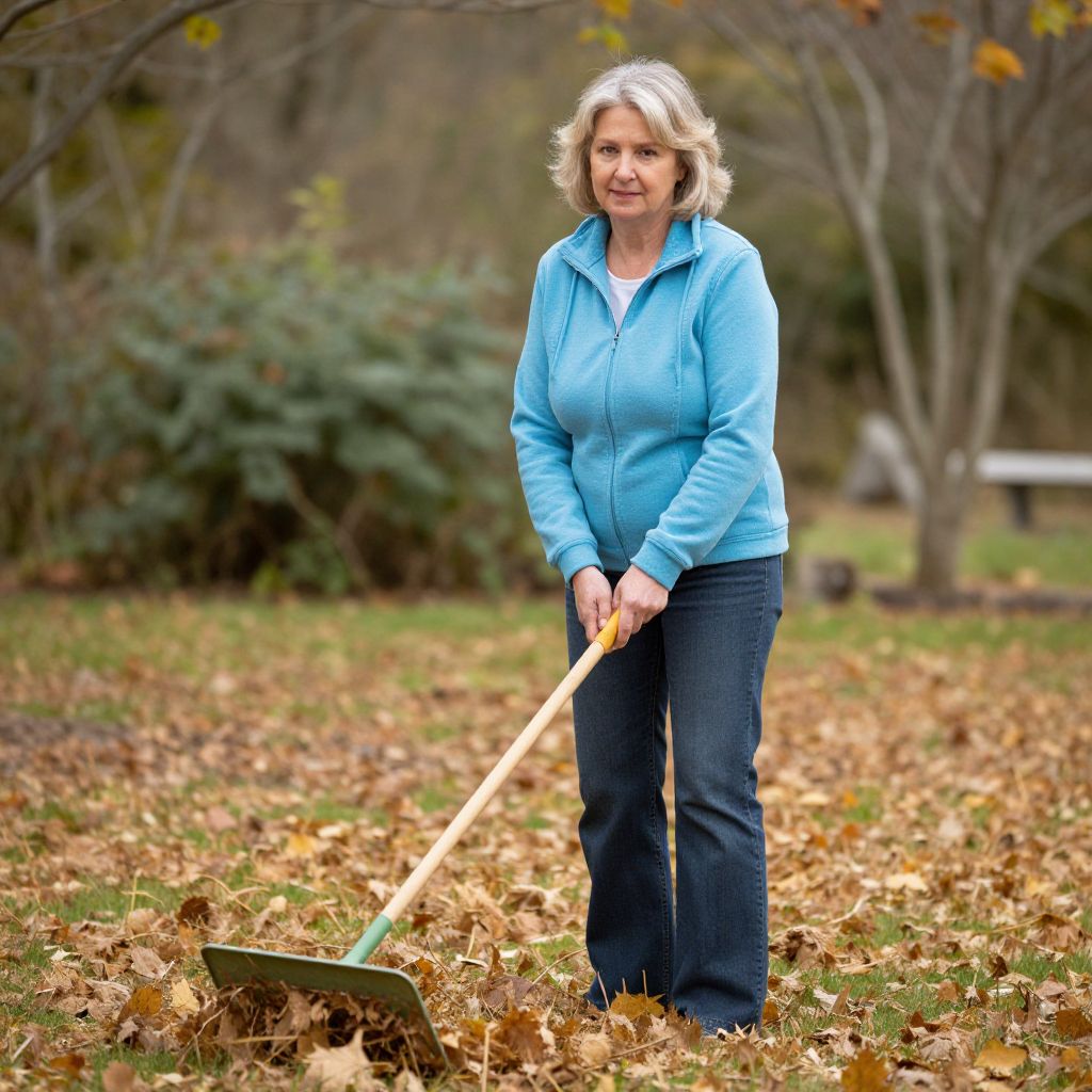 Photograph of a middle-aged blonde woman in a blue zip-up jacket and blue jeans, raking autumn leaves in a park.