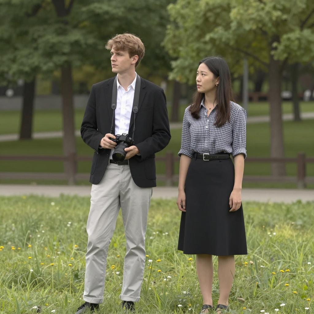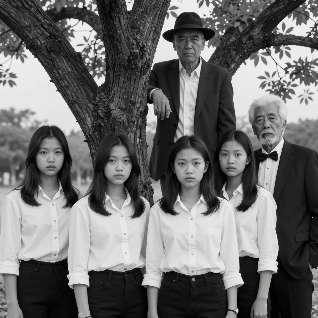 Black-and-white photograph of six people standing outside a wooden house with a porch. Three men in front: one with glasses and suspenders, one in light shirt and high-waisted pants, one in darker pants and shirt. Two women in light shirts and long skirts. One man operating a camera on a tripod to the right. One man partially obscured in the background. Wooden steps and beams on the ground.