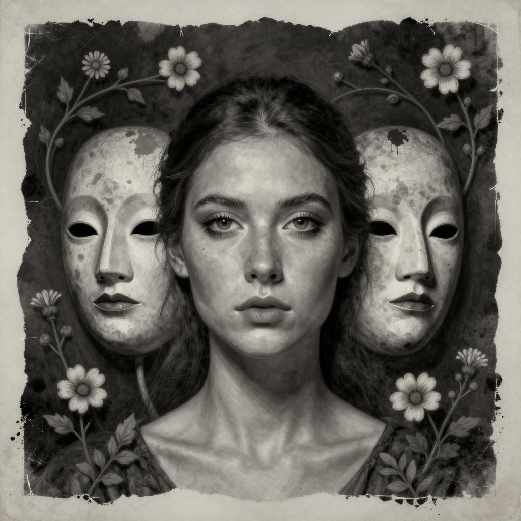 Black and white artistic portrait featuring a young woman with expressive eyes flanked by two distressed ritualistic masks. The composition includes delicate small flowers and vines, with torn and distressed edges enhancing the dramatic, stencil-like imagery. The style is grisaille, capturing mood and texture with dark, surreal, and ritualistic elements.