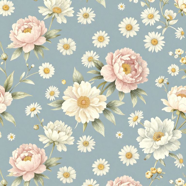 A delicate floral pattern featuring hand-drawn daisies and peonies in soft pastel hues on a dusty blue background, showcasing a vintage-inspired, retro aesthetic reminiscent of Rifle Paper Co.'s Wildwood Peonies fabric collection.