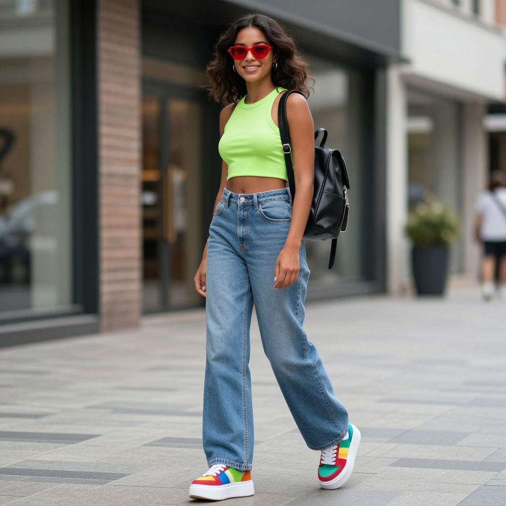 Photograph of a young woman with long black hair, wearing a rainbow crop top, bright orange high-waisted pants, and blue sneakers, standing