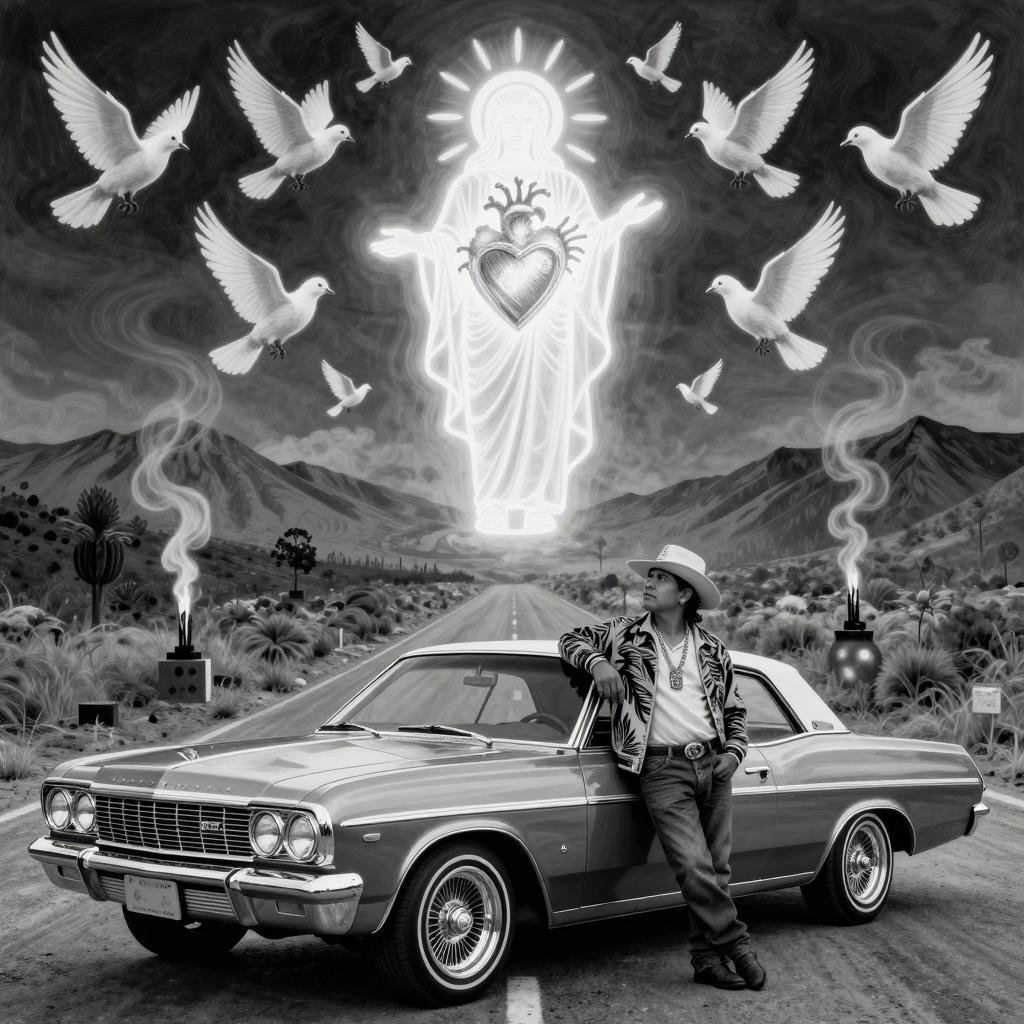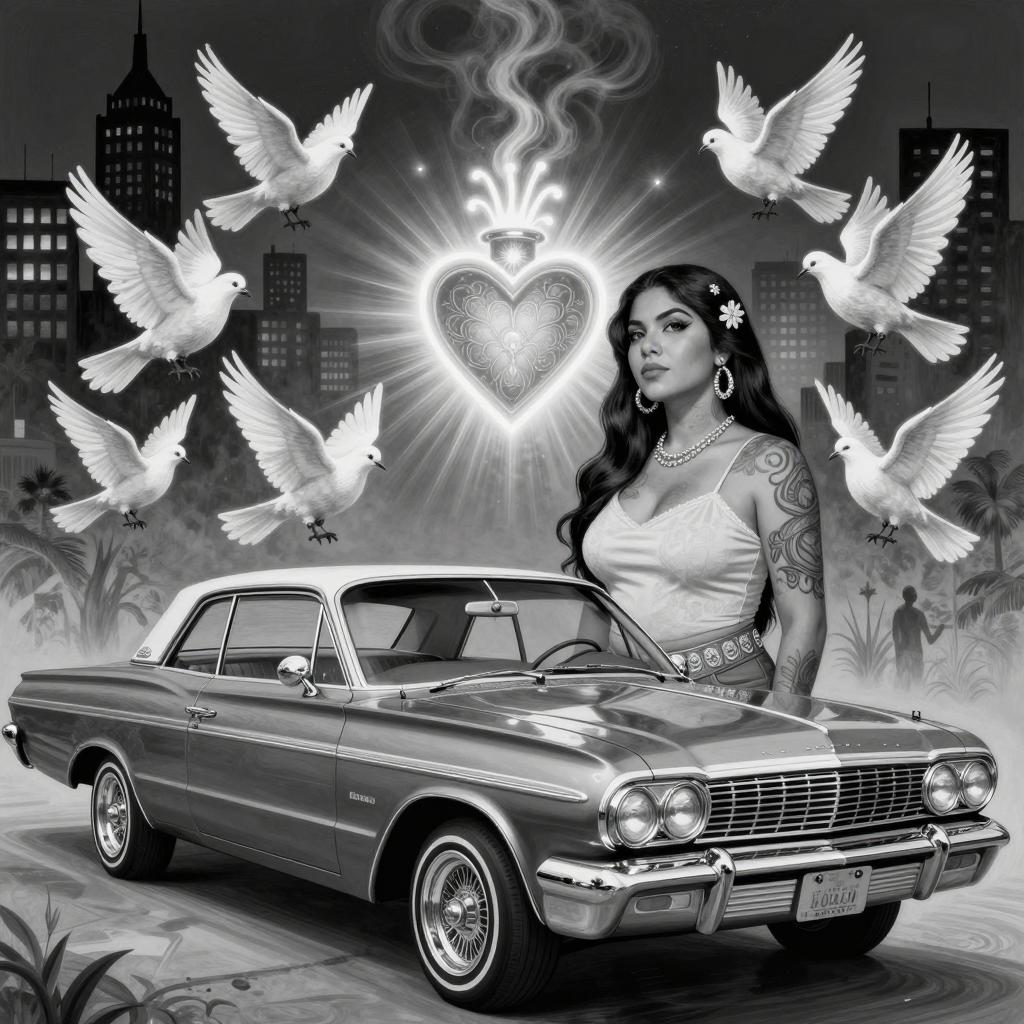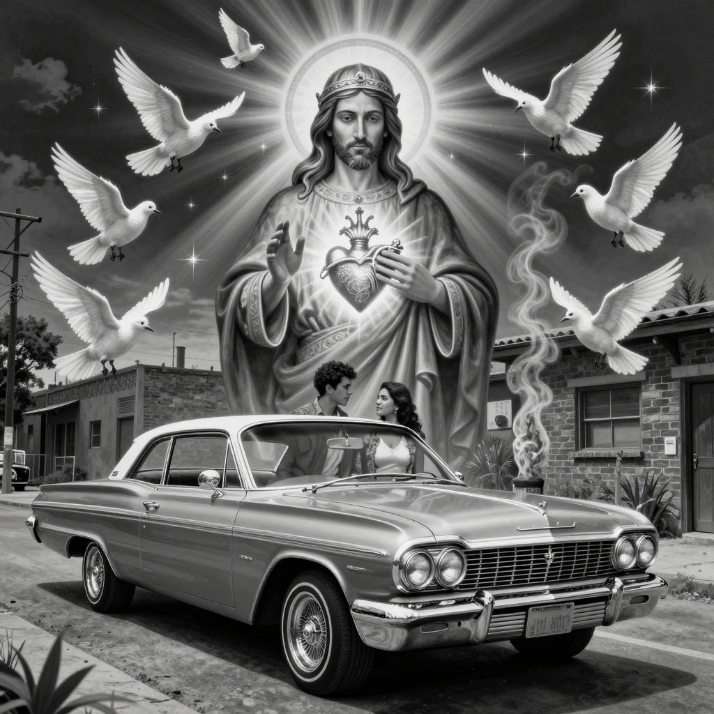 Chicano art drawing of saint-like protective figure watching over a young couple by a classic lowrider surrounded by doves, glowing sacred heart and incense-like smoke in barrio street corner with low brick buildings with dramatic heavenly light beams and deep shadows, highly detailed black-and-grey illustration, lowrider tattoo style, mural concept art