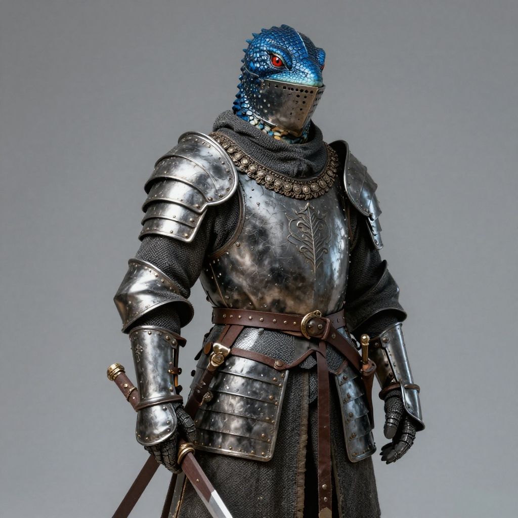 Hyper-realistic, Realism, HDR, detailed, medieval warior style, blue lizard skin armor, armor with (tunic / hauberg /rustic jaket), simple gray background