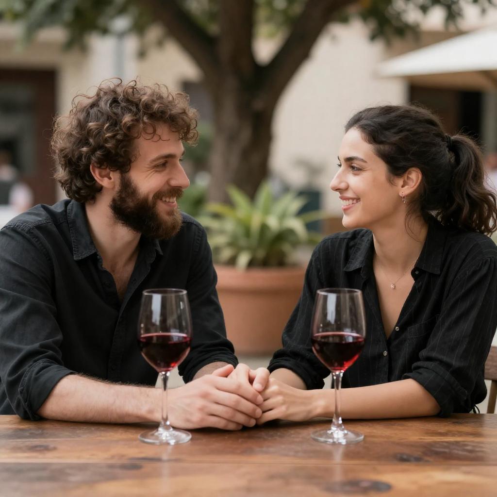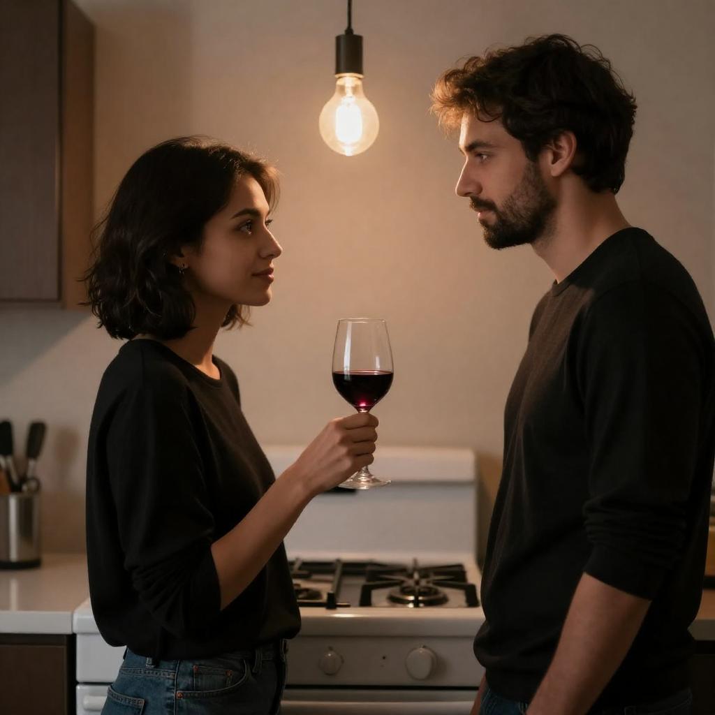 Photograph of a couple in a dimly lit kitchen. The woman with short black hair, wearing a black long-sleeve shirt, holds a glass of red wine towards the man. The man, with dark brown hair and a beard, also in a black long-sleeve shirt, looks at her. A white stove and a single glowing light bulb are in the background.