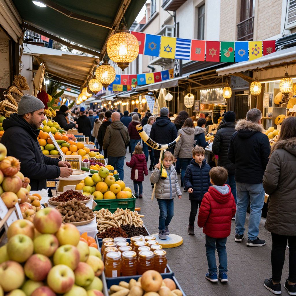 Hashanah festival in a bustling market with vibrant fruits and spices, vendors selling apples and honey jars, children playing near a decorative shofar stand, soft glowing lanterns hanging overhead, joyful community gathering celebrating the Jewish New Year with colorful banners.