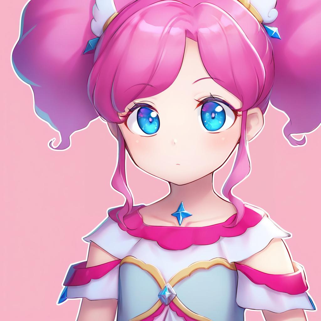 Digital illustration of an anime girl character with bright pink twintails and large blue eyes. She wears a detailed costume in white, pink, and blue with star-shaped accessories. The character has a soft pastel color palette and a smooth, glossy art style on a pink background.