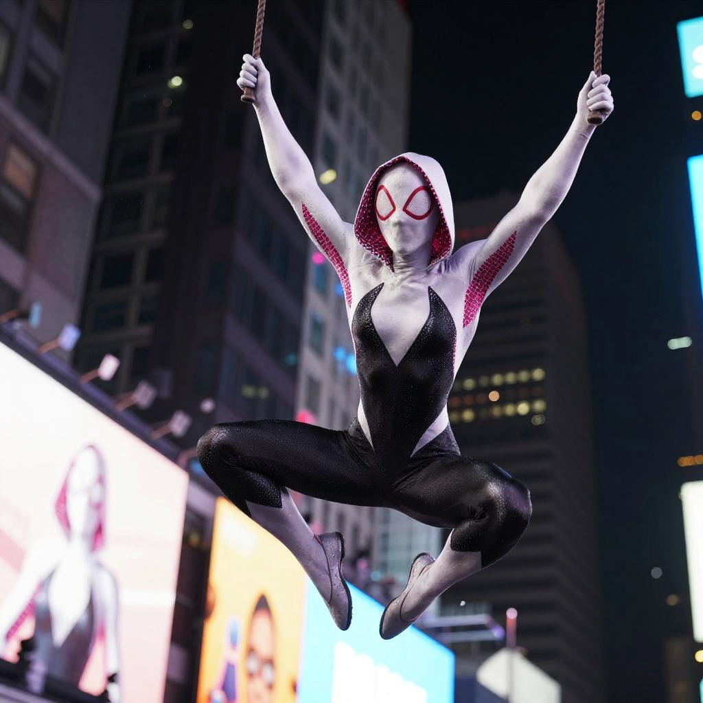 A person dressed as Spider Gwen in a black and white spider suit with pink details swings airborne on ropes in the brightly lit urban setting of Times Square at night. The costume features a hood and distinct pink eye patterns, emphasizing an acrobatic and dynamic pose against the backdrop of neon lights and tall buildings.