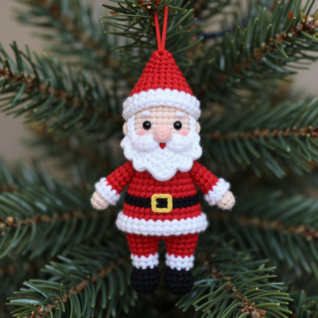 A photograph of a crocheted Santa Claus ornament hanging on a green, pine tree. The Santa figure has a round face with a pink nose, black eyes, and a white, curly beard. He wears a red hat with a white pom-pom, a red jacket with white trim, a black belt with a gold buckle, and red pants with black boots. The tree's needles are detailed and textured, with blurred red and gold baubles in the background. The red string from the ornament is visible at the top.