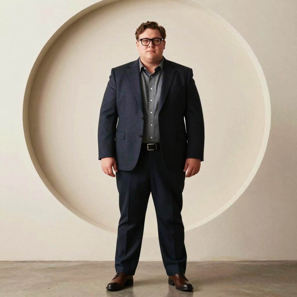 A confident adult man with light skin tone and short brown hair stands in front of a beige wall featuring a large circular indentation. He is dressed in a dark blue suit, gray button-up shirt, black belt, and brown dress shoes. The man wears black-rimmed glasses and looks directly at the camera.