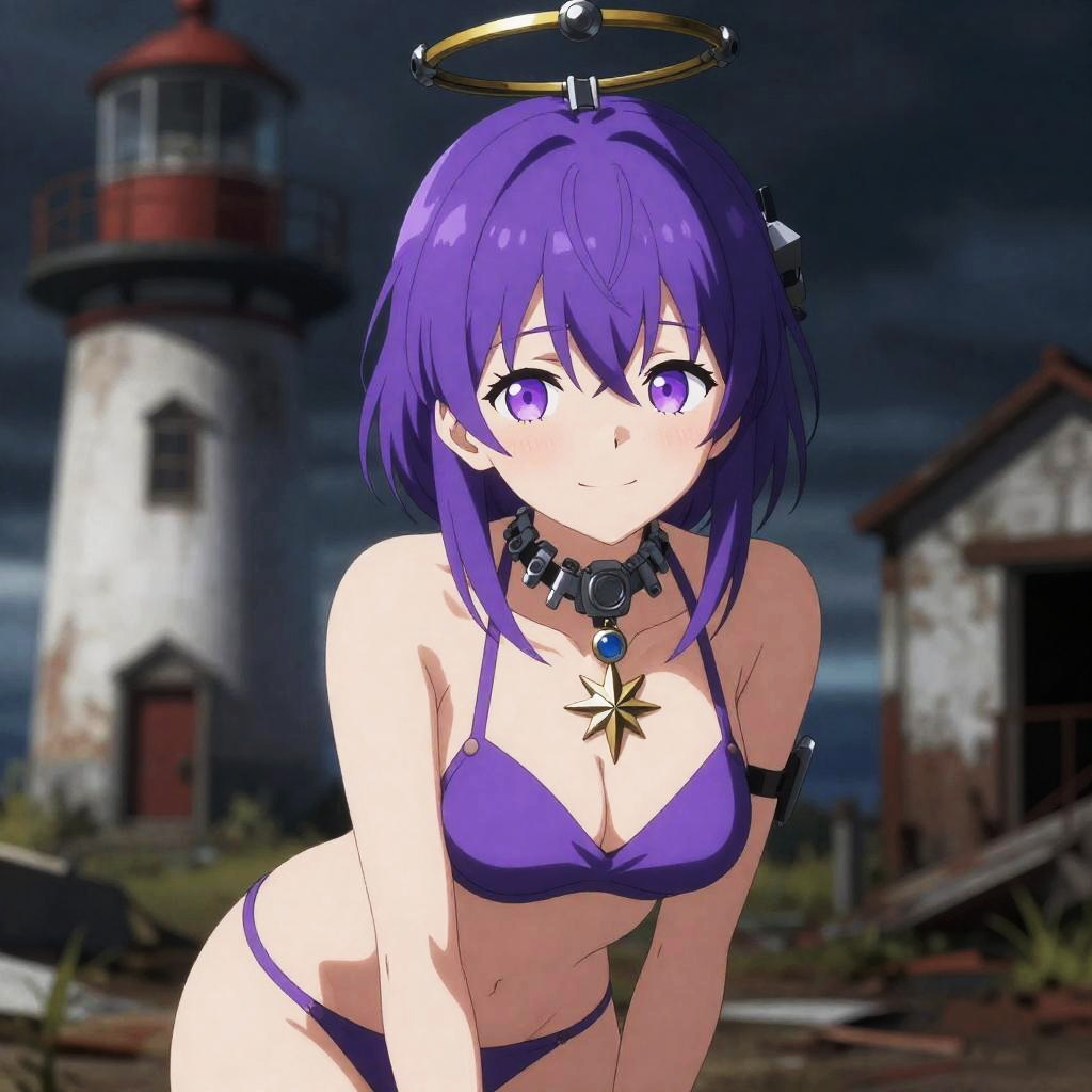 Upper body, admiral kancolle, 1girl, purple hair, short hair, purple eyes, smiling, blush, mole under eye, hair between eyes, purple panties, mechanical halo, collarbone, playful, abandoned lighthouse, dramatic shadows, compass rose pendant
