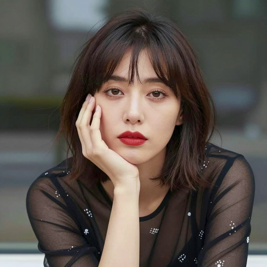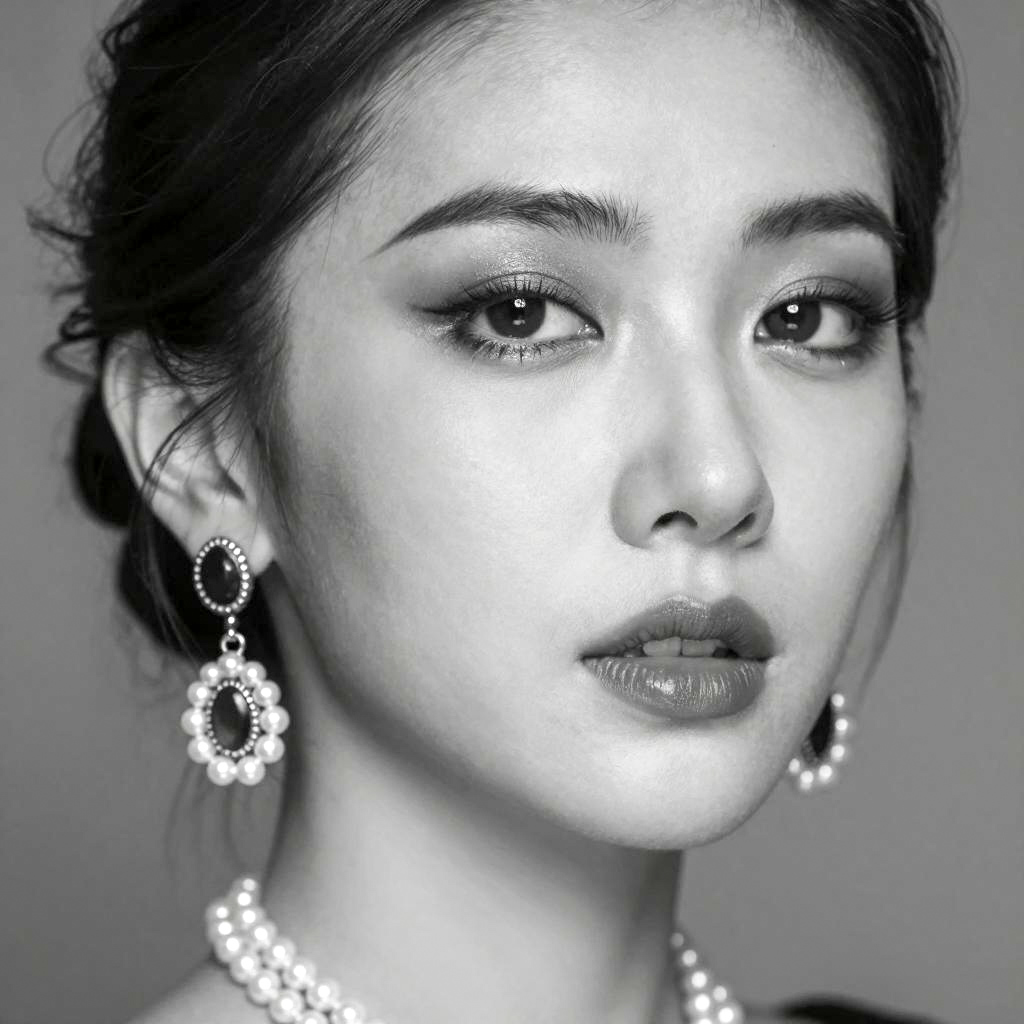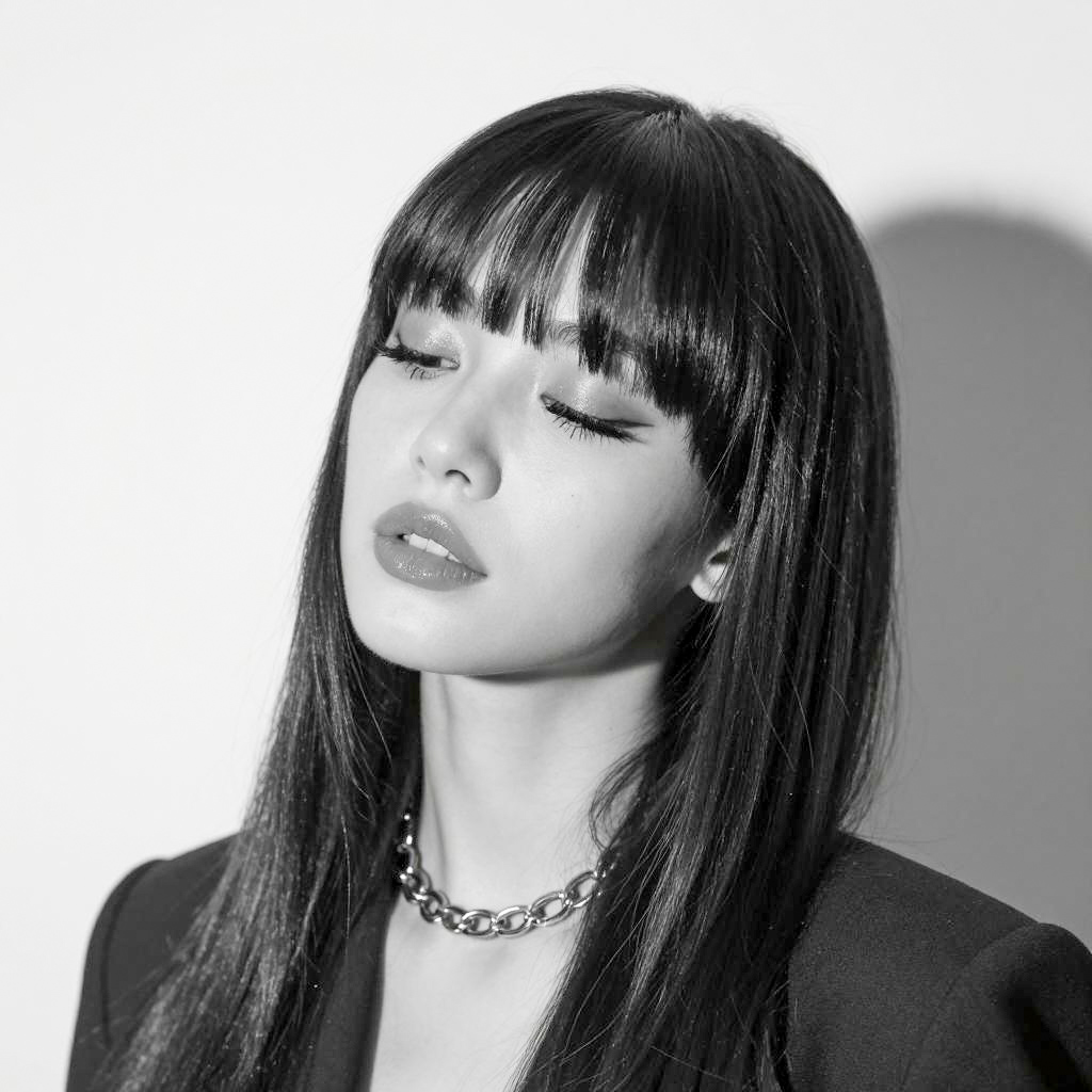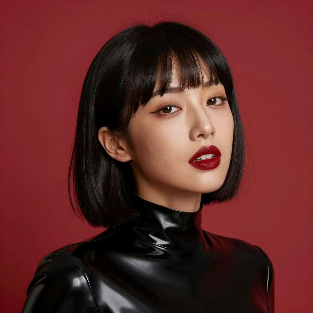 Black and white photograph of a woman with short, straight black hair and bangs. She has light skin, full lips with lipstick, and dark eyebrows. She wears a geometric patterned off-shoulder top and chain earrings. She gazes over her shoulder with a slightly parted mouth. Her right shoulder is exposed, and the background is a gradient from light to dark gray.