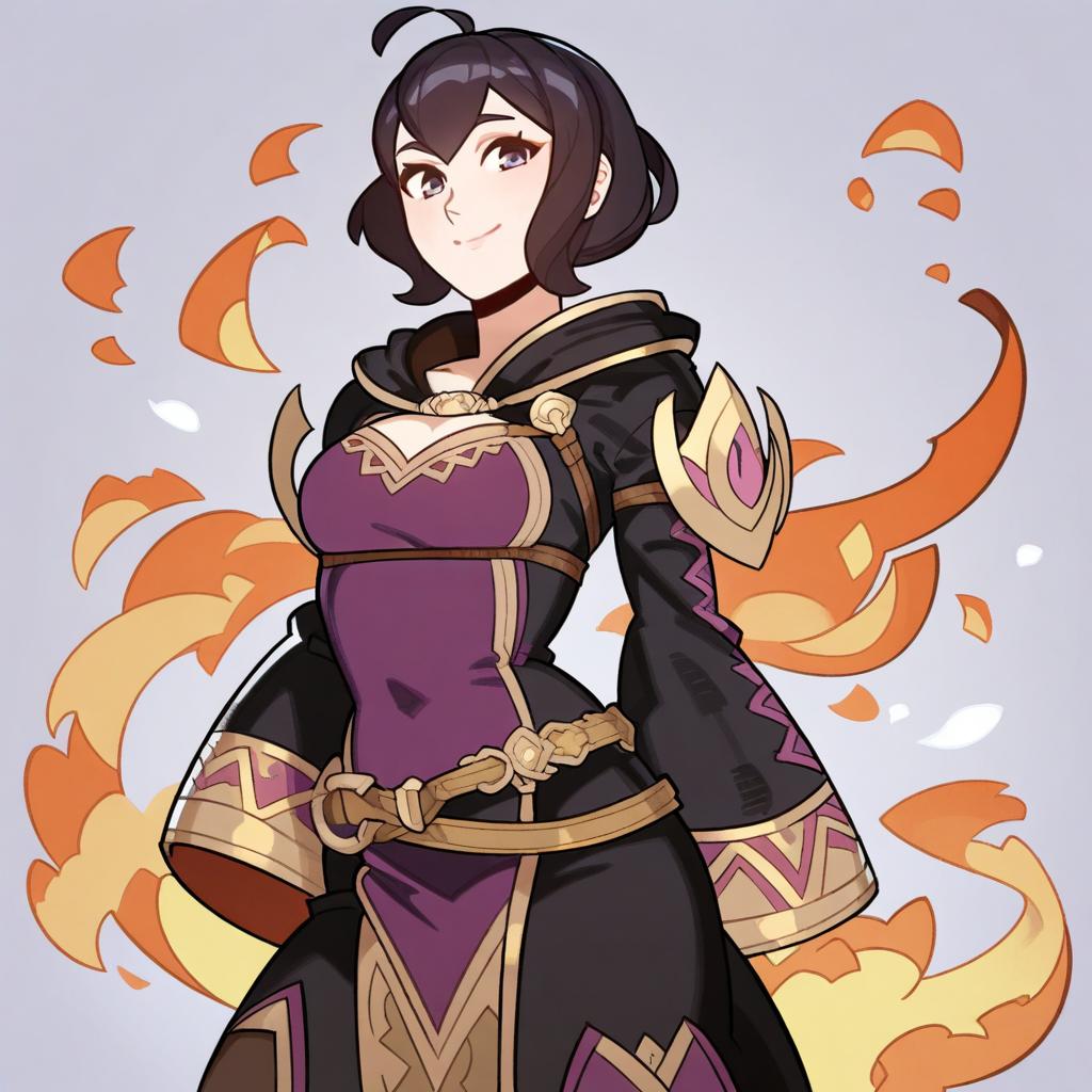 Digital illustration of an anime-style female mage character with short black hair, purple eyes, and an ahoge. She is wearing a detailed purple and black outfit with gold accents, long sleeves, and a decorative belt. Orange and yellow magical flame effects surround her, enhancing the fantasy theme.