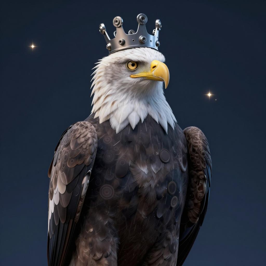 Gradient eagle with a mechanical crown portrait, deep navy full bleed with minimalistic glowing stars, wide angle portrait by Ridley Scott, ultra high detail, NVIDIA Iray render, ultra high definition, ArtStation quality, smooth, sharp focus, Photorealism, depth of field, 3D super resolution, octane render, award-winning photo