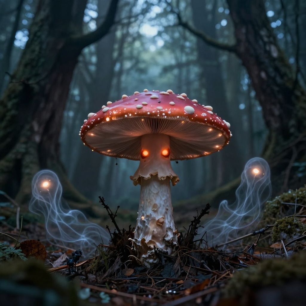 Evil mushroom sprouting from a cursed forest floor, eyes burning with malevolence, surrounded by ghostly wisp lights and decayed trees, dark mystical atmosphere