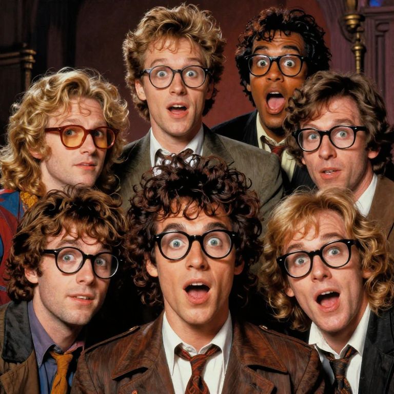 Turbulent 80s fantasy movie poster about super nerds with glasses in the style of artist frank frazetta, multi-racial, multi gender, zany, goofy, fun, cheeky,