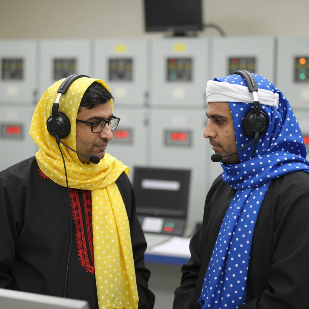 Two men in a control room. Left man wears yellow polka dot headscarf, glasses, black shirt with red embroidery. Right man wears blue polka dot headscarf, black shirt, white headpiece. Both have headsets. Background filled with control panels. Left man leans forward, right man slightly bent. Shelves with equipment in background.