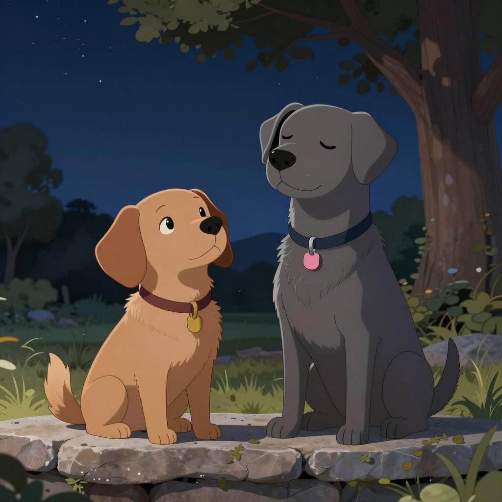 Digital illustration of three anthropomorphic dogs in a dimly lit alley. Central brown dog with erect ears looks at orange dog with long ears and blue collar, sitting at a table with spaghetti. Left, white dog with black mustache and striped vest plays accordion, smiling. Table has candle, green bottle, and red napkin holder. Brick walls in background.