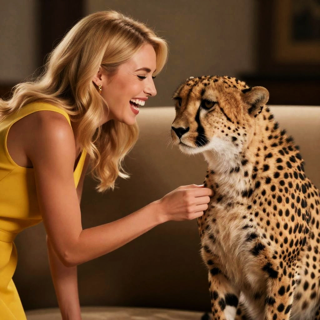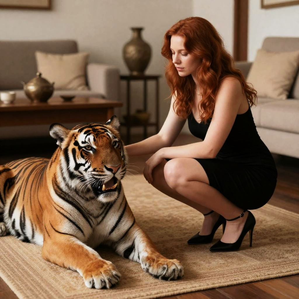 Red-haired woman in black dress and heels, squatting beside a tiger lying on a rug. Tiger's mouth is open. Living room with furniture, table, and decorative items in background. Woman looks down at tiger. Soft light. Warm colors.
