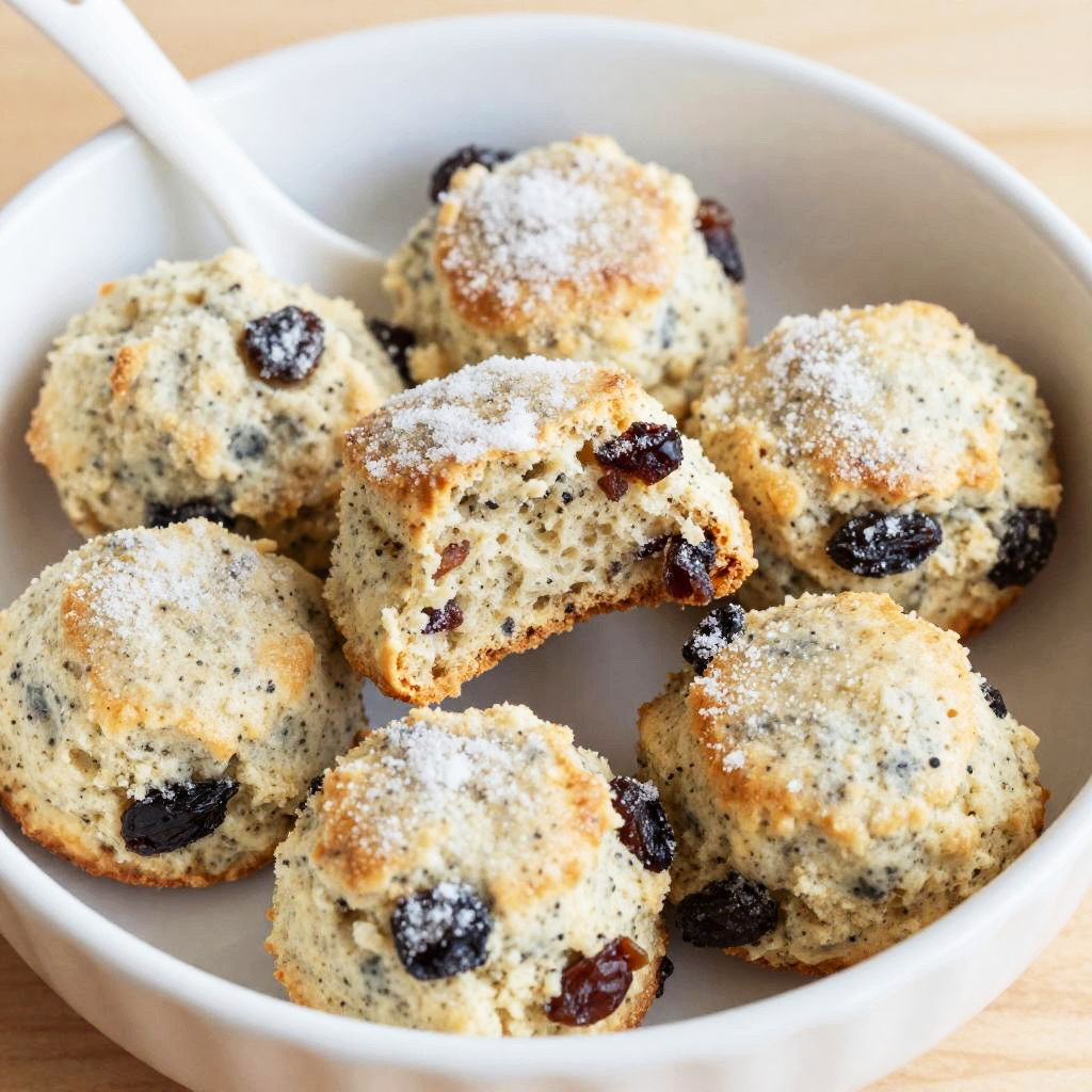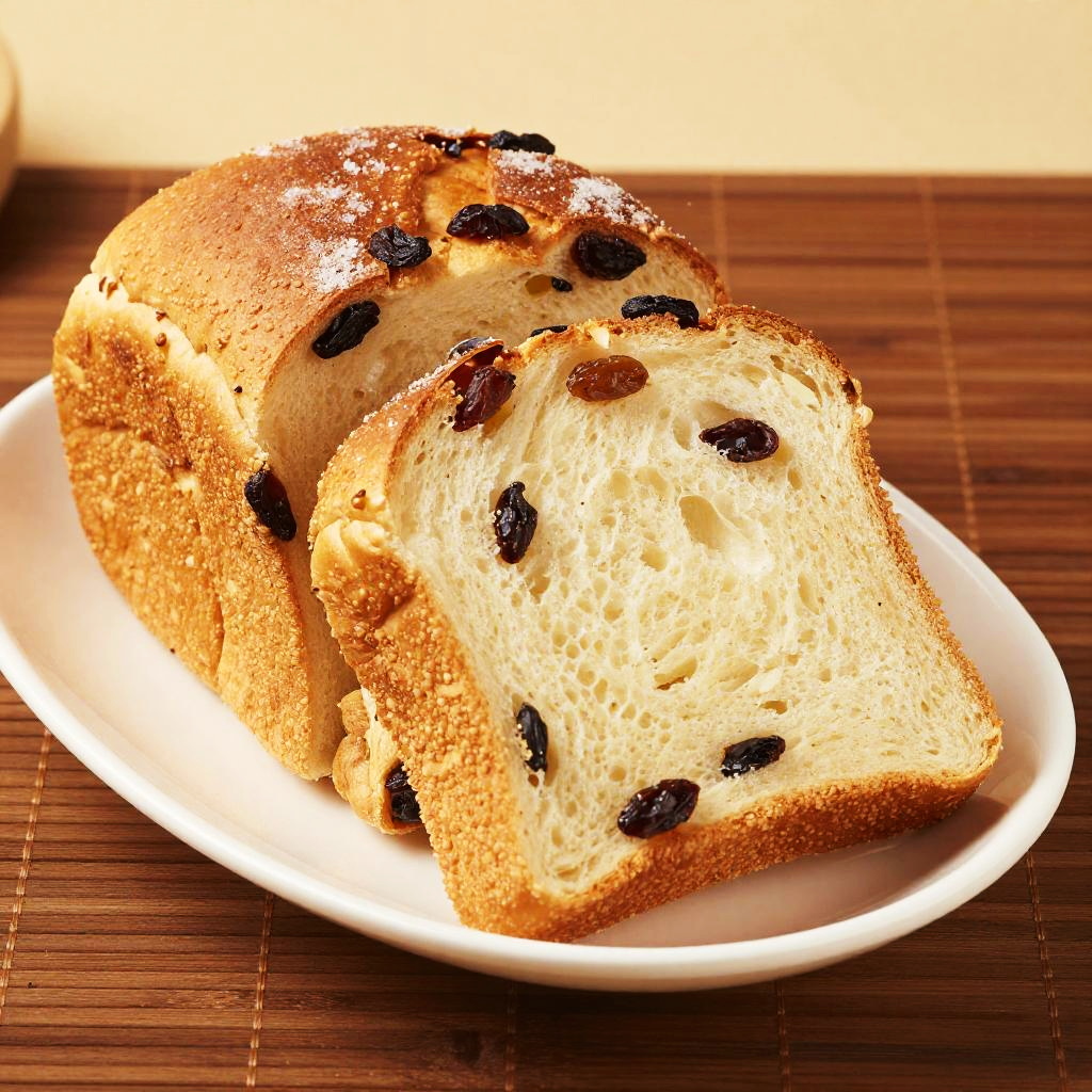 A close-up photo of a slice of golden-brown bread with visible dark raisins, resting on a white oval plate. The bread has a slightly crispy top with a light dusting of sugar. It's placed on a dark brown bamboo mat, which adds a textured background. The image has a warm, inviting feel with bright, natural lighting.
