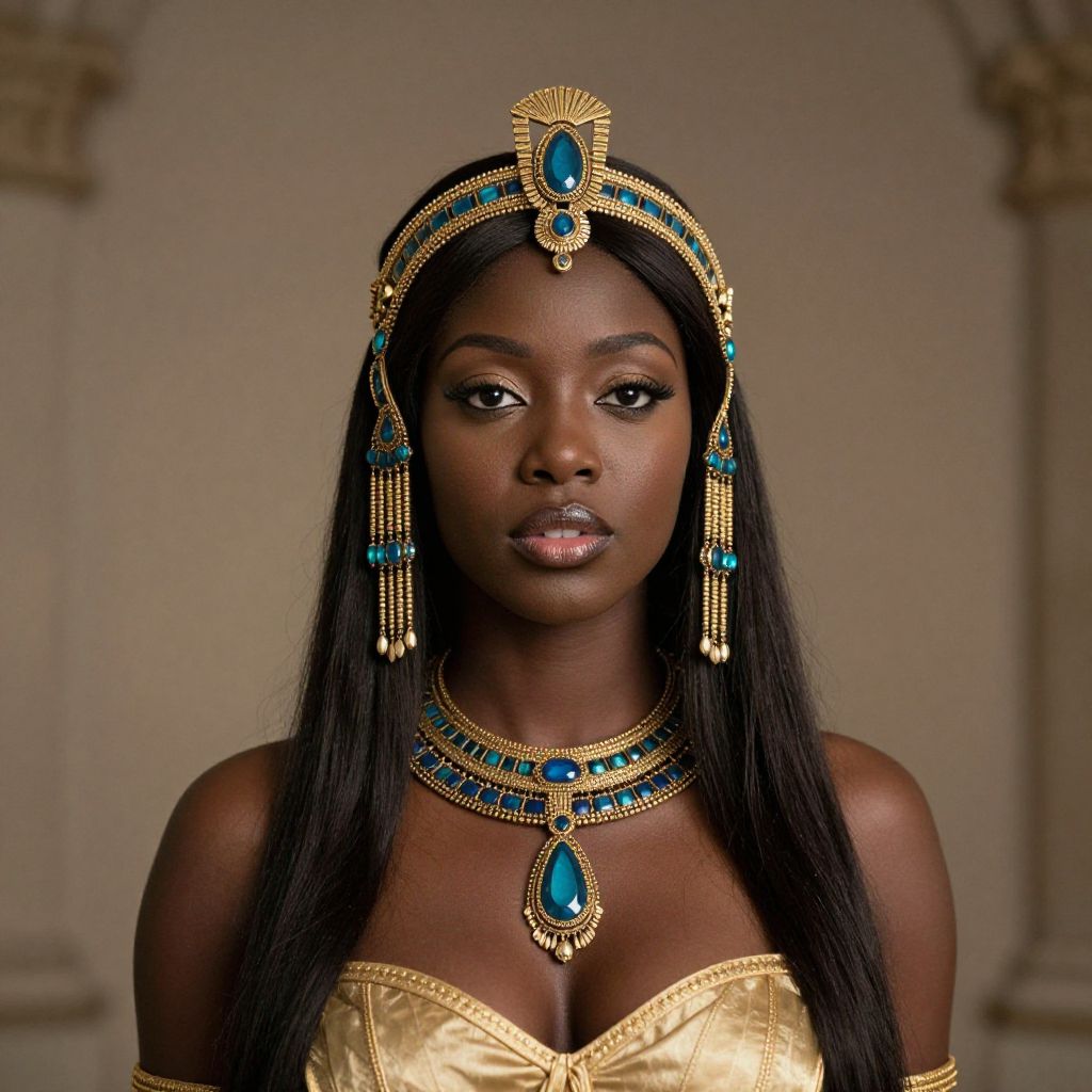 Photograph of a dark-skinned African woman with long, wavy black hair, standing outdoors. She wears an ornate red and gold traditional Indian outfit with intricate embroidery, a deep neckline, and a matching red saree draped over her shoulder. Her jewelry includes a large, detailed gold necklace, dangling gold earrings, and red and gold bangles. She has a serious expression and is holding her hands together in front of her. The background is softly blurred, featuring beige walls and potted plants, highlighting the subject. The overall style is elegant and traditional.