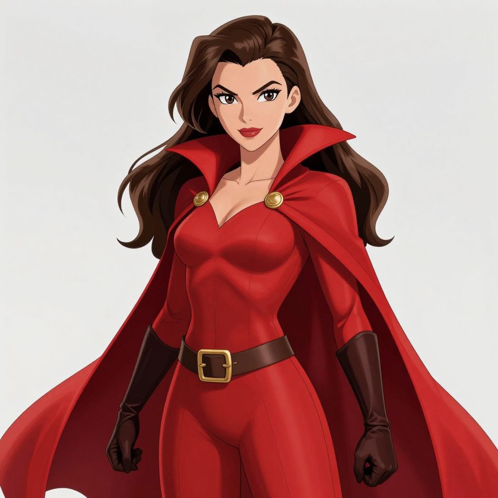 Digital anime-style illustration of a confident woman with fair skin and long, dark brown hair. She wears a form-fitting, red bodysuit with a plunging neckline, accentuating her moderate-sized breasts. A red cape with gold buttons drapes over her shoulders, and she dons black gloves and a black belt with a gold buckle. Her expression is determined, with slightly raised eyebrows and a subtle, confident smile. The background is plain white, emphasizing her striking outfit and pose. Her overall appearance exudes a superhero or action heroine vibe.