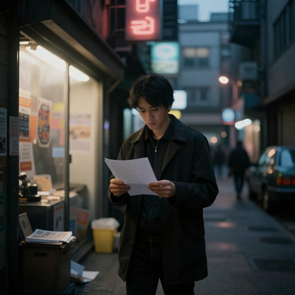 Photograph of a man in a dark coat holding a paper in a neon-lit, urban alley at night. He stands in front of a brightly lit, cluttered storefront with various signs and posters. The background features blurred city lights and buildings, creating a moody, cyberpunk atmosphere.