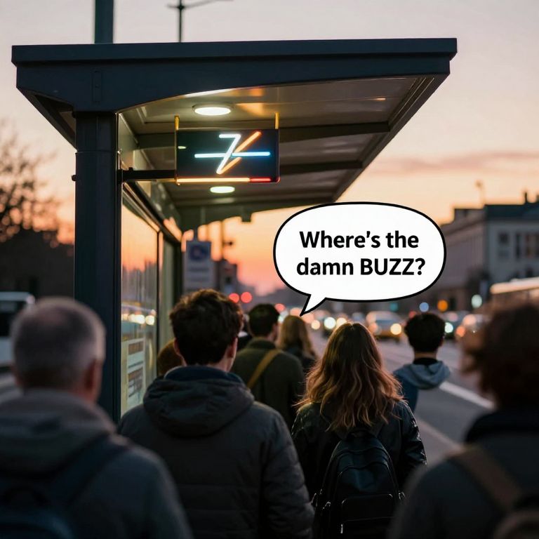Photograph of a crowded bus stop at sunset, neon lightning bolt sign, speech bubble reads "Where's the damn BUZZ?", people in winter coats