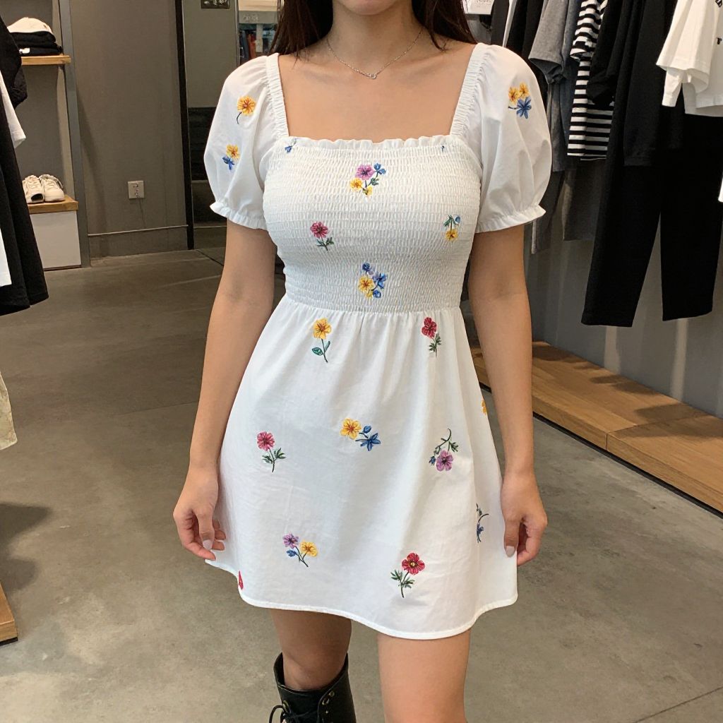 Photograph of a young woman standing in a modern clothing store. She has long dark hair and wears a white, short-sleeved, square-neck dress with a smocked bodice and floral embroidery in red, blue, and yellow. The dress is slightly above mid-thigh length. She has a slim build and wears black ankle boots. The background includes gray walls, a concrete floor, and hanging clothes, including white and black garments. The store has a minimalist style with wooden shelves and a glass display. The lighting is bright, highlighting the dress's fabric and floral details.