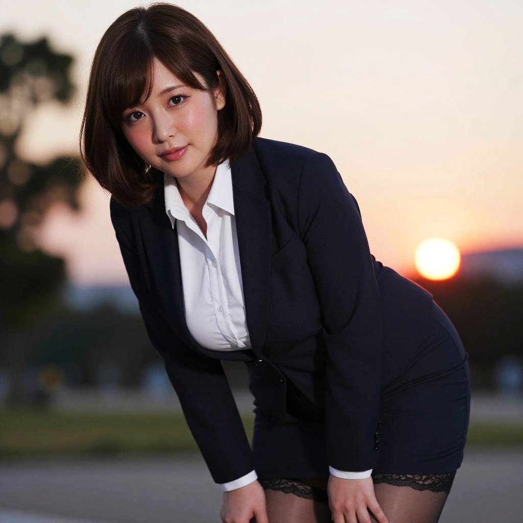 (masterpiece, best quality, semirealistic:1.3), Itsuki Shima, mature female, (sitting on chair:1.2), spread legs, (black pantyhose:1.3), lace panties, 1girl, solo, full body shot, short hair, brown hair, bob cut, brown eyes, huge breasts, cleavage, looking at viewer, office lady, formal, suit, pencil skirt, skirt suit, jacket, collared shirt, perfect body, perfect eyes, anime eyes, eyeshadow, perfect face, (blush, smirking:1.1), evening park background, sunset, sharp focus, professional artwork, intricate details, vibrant colors, vivid colors, Diffused lighting, digital blending, ultra detailed body, ultra detail hair, ultra detail face, trending on pixiv