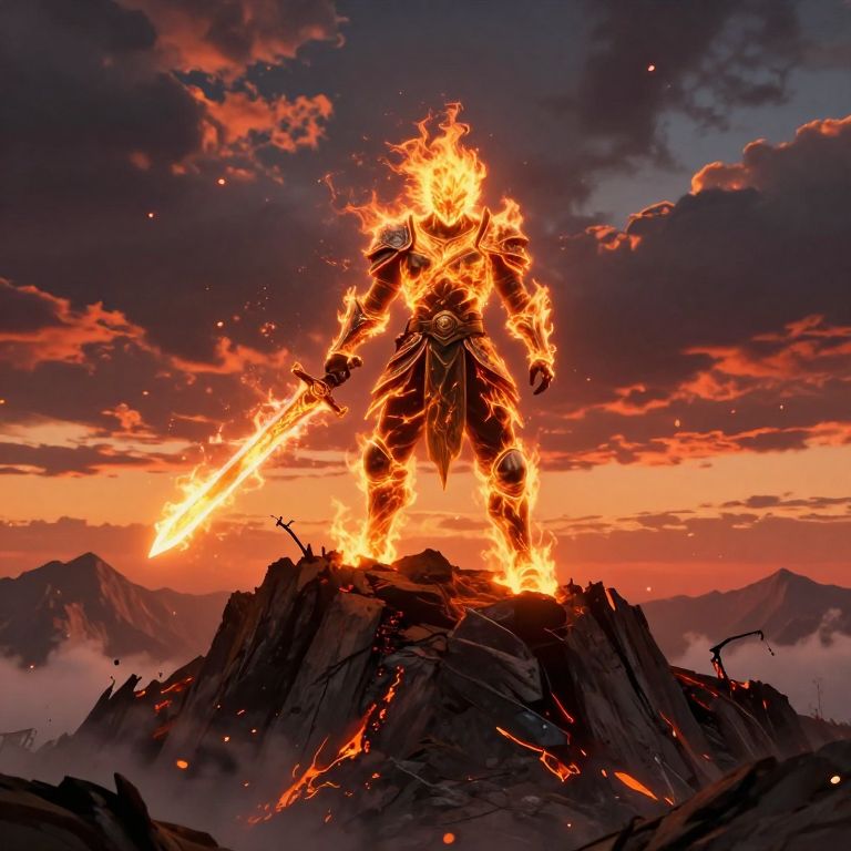 Digital artwork of a fiery, armored warrior standing on a mountain peak at sunset, wielding a glowing sword, surrounded by dark clouds and distant mountains.