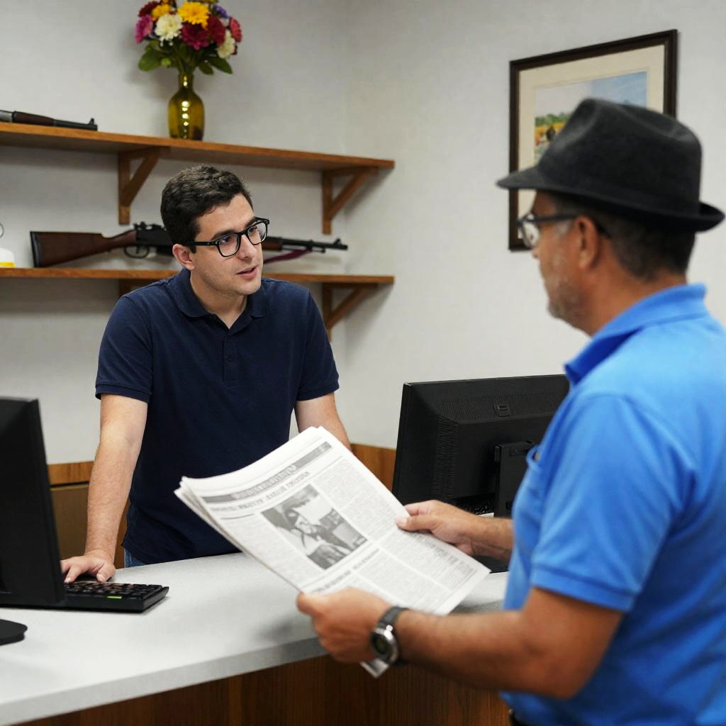 Photograph of two men in a small office. Young man with short dark hair, glasses, navy polo, talking to older man with glasses, black hat, blue shirt, holding newspaper. Wooden shelves with rifles in background, flower vase, framed art on wall. Young man facing left, older man facing right. Office counter between them.