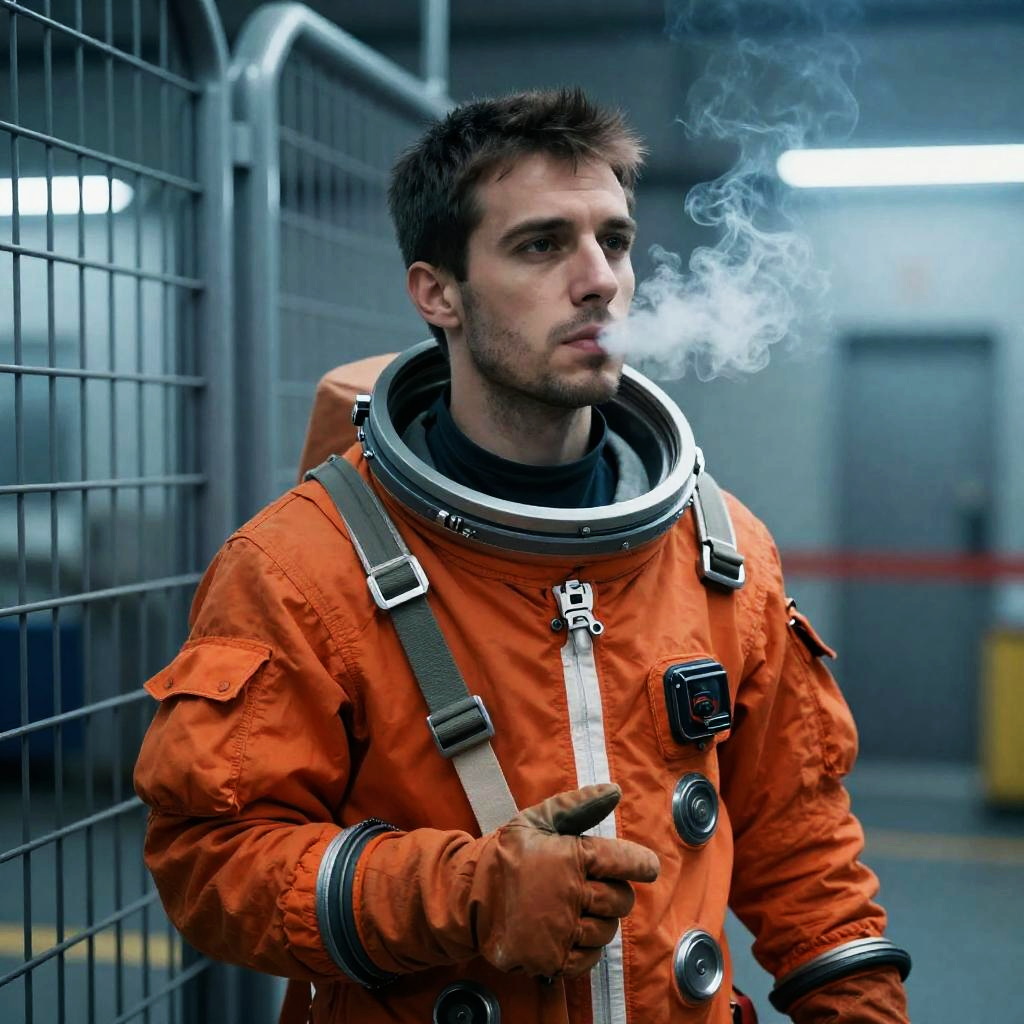 Photograph of a man in an orange spacesuit with gray straps and gloves, standing near a metallic fence. He has short dark hair, a stubbled face, and is smoking with visible smoke around his mouth. Background includes industrial elements, blue lighting, and red lines. He looks to the right with a neutral expression. Blue and white colors dominate the scene.