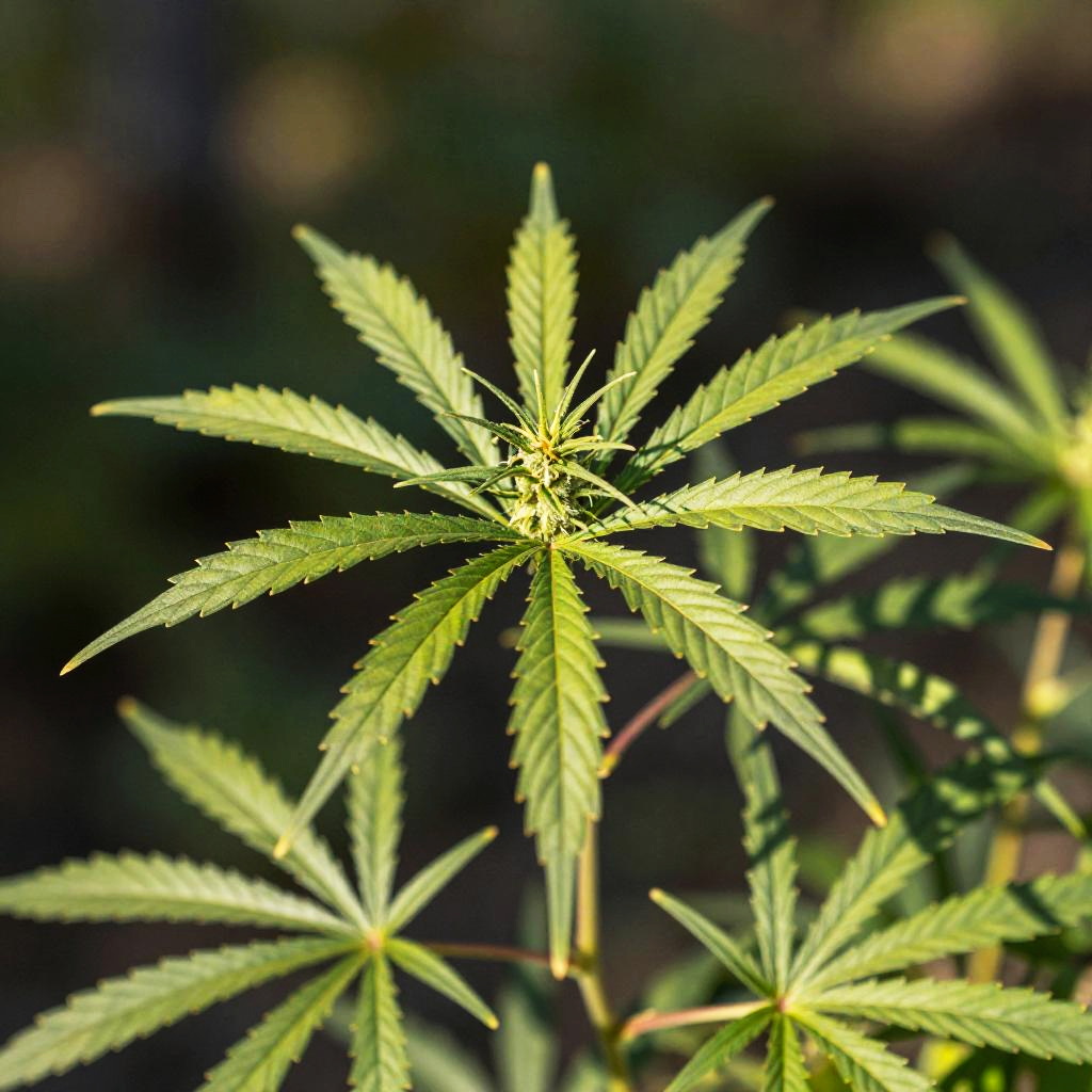 Cannabispflanze vibrant green leaves under soft morning sunlight, detailed close-up showing trichomes and intricate leaf patterns, natural outdoor setting with blurred forest background, high-resolution botanical illustration style.