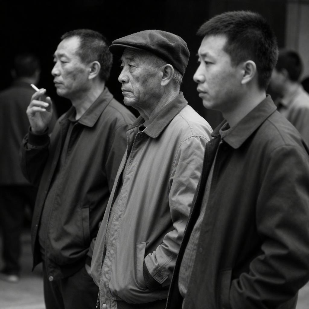 Black-and-white photograph of a traditional Chinese courtyard with large, ornate wooden pillars and a tiled roof. Several people, including a person in a white shirt and another in a hat, walk among scattered pigeons on the stone ground. The background includes more tiled buildings. The image has a high-contrast, grainy ure.