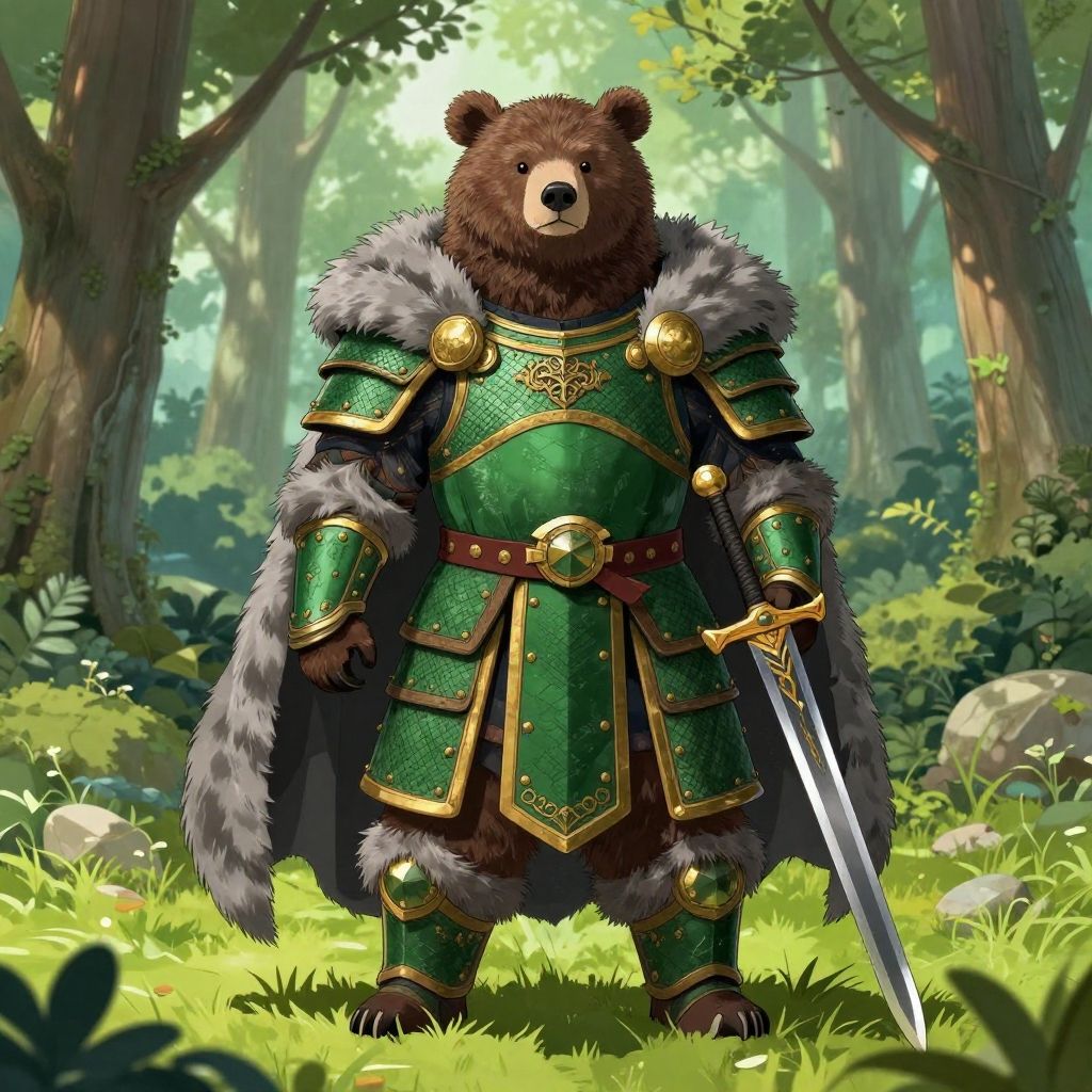 A medieval-style anthropomorphic bear knight standing in a lush green forest. The bear is wearing detailed green armor with gold accents and shaggy fur trim, accompanied by a luxurious grey fur cape. The knight holds a sword with an ornate hilt, blending fantasy and manga-inspired artistic style.