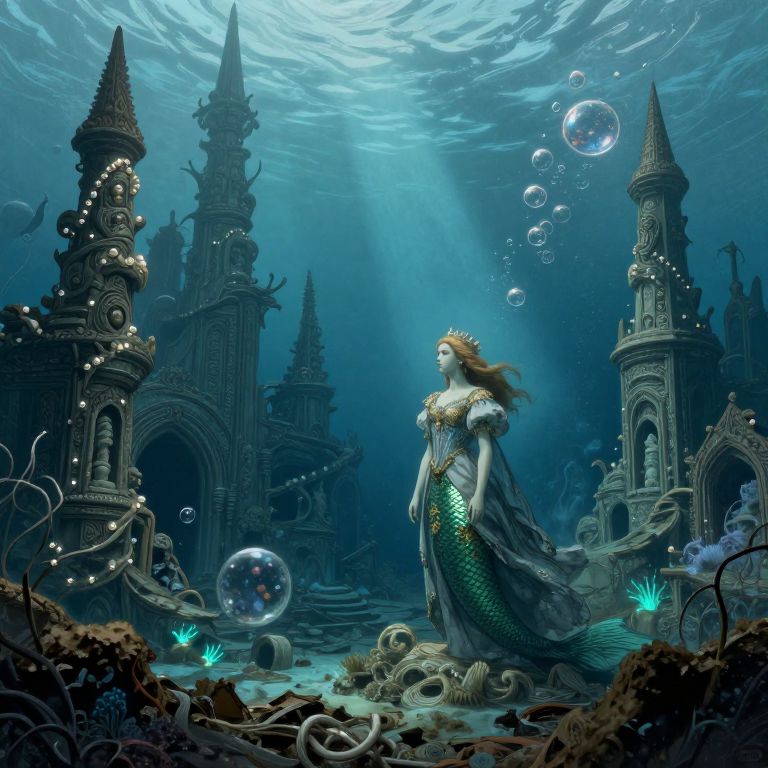 Imagine an underwater realm inspired by the intricate illustrations of Gustave Doré, where a once-thriving mermaid city now lies in ruins beneath swirling ocean currents. This sunken metropolis features towering spires adorned with exquisite carvings and shimmering pearls that reflect the ambient glow from bioluminescent sea creatures. Amidst the wreckage stands a solitary figure dressed in tattered royal attire, solemnly guarding her forsaken kingdom, as enigmatic bubbles containing whispers of the civilization's forgotten past drift around her. The scene masterfully combines melancholic longing with awe at the majesty of this lost underwater world.