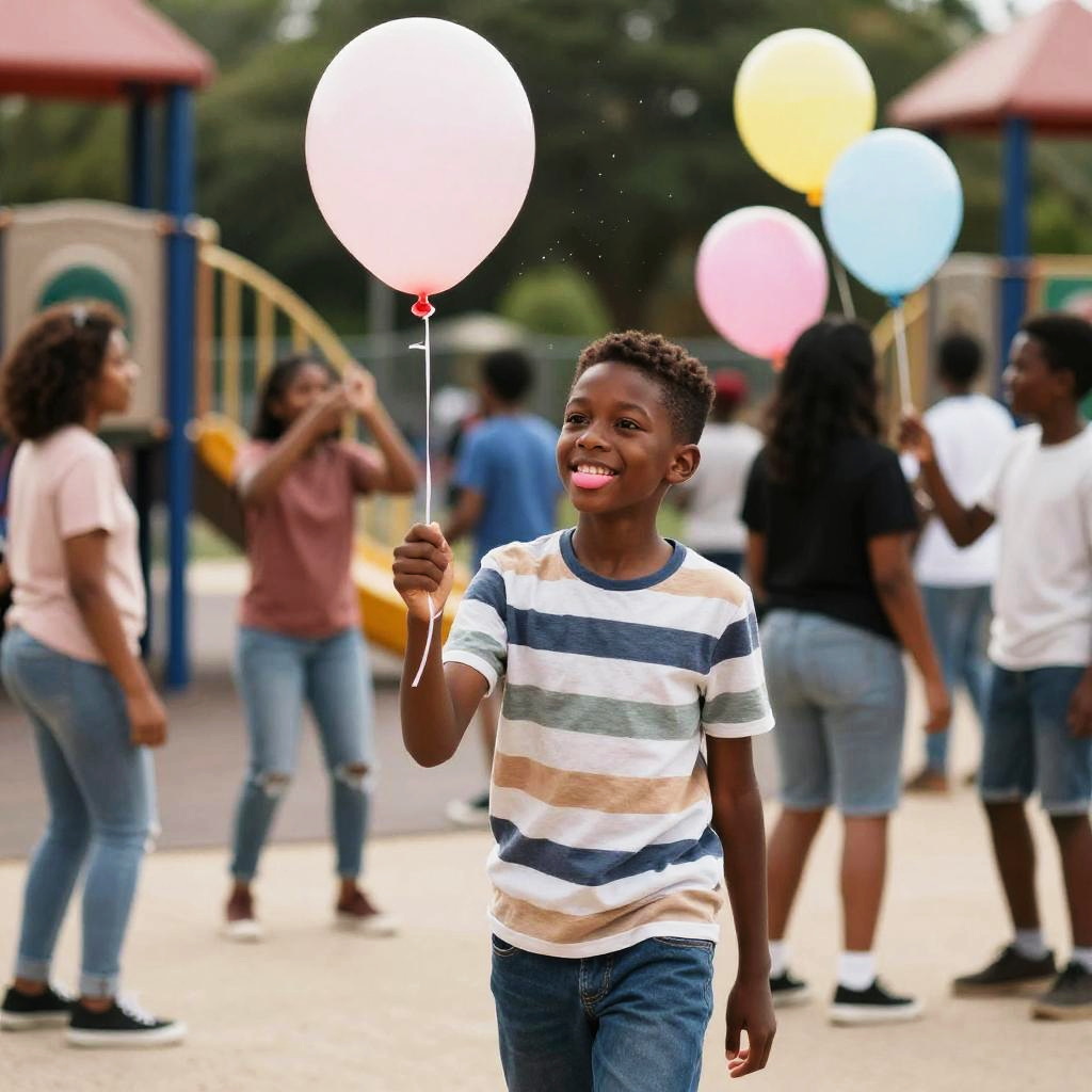 An Afrofuturism-inspired illustration of a adolescent boy with short afro and red scarf holding helium balloons. Set against a navy blue and silver background, the design emphasizes bold and elegant features in a stylized, vibrant art form.
