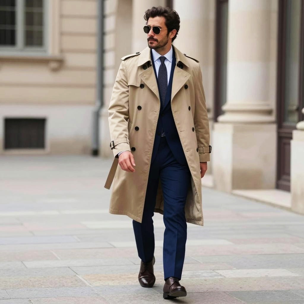 A stylish man walks confidently along a stone pathway, wearing a classic beige trench coat over a smart blue ensemble. The historic architecture in the background adds a timeless elegance to the scene, accentuating the man's sophisticated look.