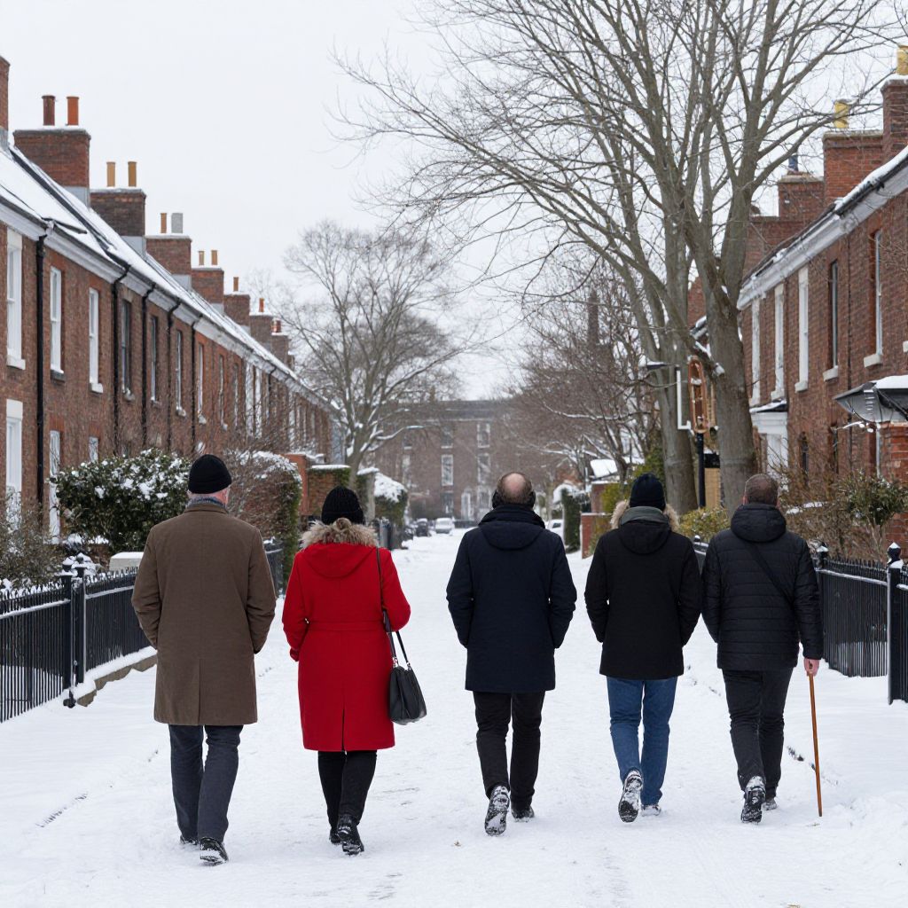 Snow-covered street lined with brick houses and leafless trees, where six figures walk away, including a man in a brown coat and hat, a woman in a red coat carrying a bag, and three individuals in dark attire, one holding a cane, all heading toward the horizon under a pale sky.