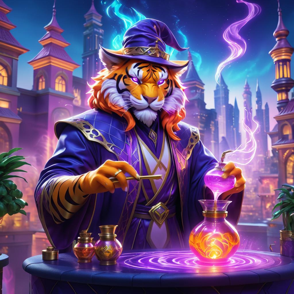 A detailed digital artwork of an anthropomorphic tiger dressed in elaborate sorcerer's robes, mixing glowing magical potions on a table. The scene is set against a mystical, vibrant cityscape with towering spires and luminous magic flames. The tiger character sports a fierce expression with bright orange fur, black stripes, and a blue gem on its forehead. The glowing potion bottles emit swirling colorful smoke, enhancing the magical atmosphere. The style is cinematic, inspired by Magic: The Gathering card art.