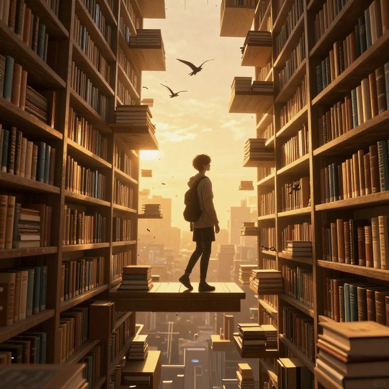 In a surreal, cyberpunk-inspired digital artwork, a young figure navigates a towering library of floating bookshelves, where golden-hour lighting casts ethereal shadows as birds soar above, symbolizing the cataloging of dreams that seamlessly blend into the real world.